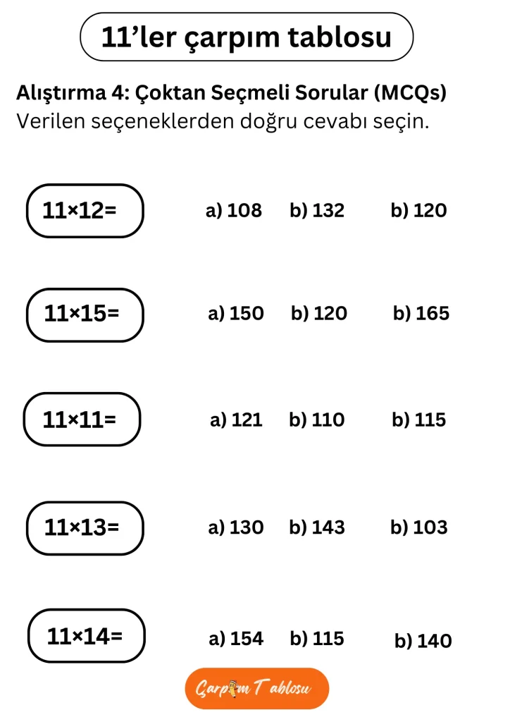 Çoktan seçmeli sorular (11 Çarpım Tablosu)