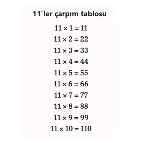 11 çarpım tablosunu kavramak için, sayısal desenlerini ve tekrarlarını fark etmelisiniz. İşte 11 çarpım tablosu referans olarak: