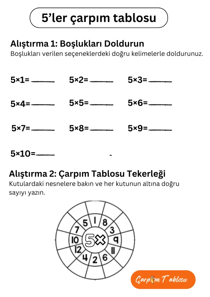 Boşlukları doldurarak 5 çarpım tablosundaki bilginizi test edin.