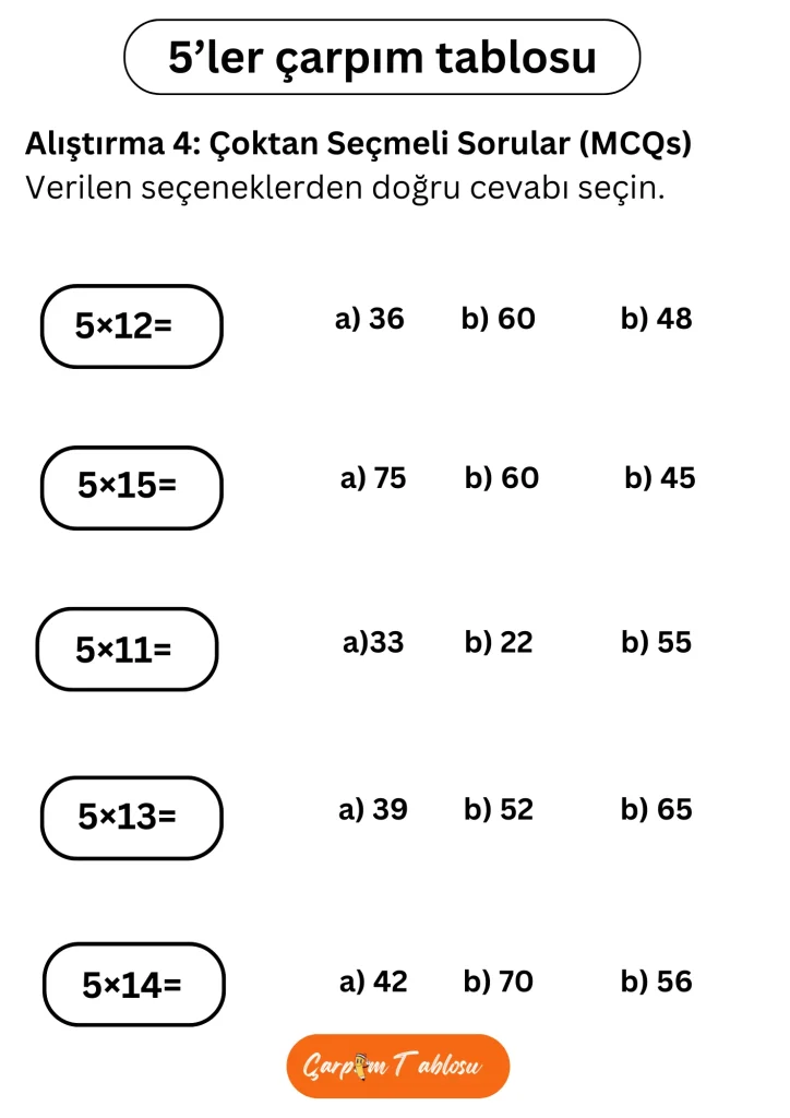 Çoktan seçmeli sorular (5 Çarpım Tablosu)