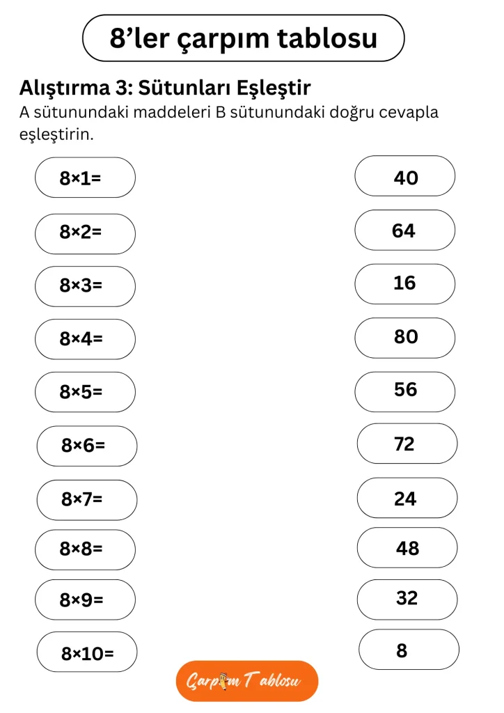 8 çarpım tablosu alıştırma sayfasına hoşgeldiniz! Burada, 8 çarpım tablosunu öğrenmek ve pratik yapmak için çeşitli alıştırmalar tamamlayabilirsiniz.