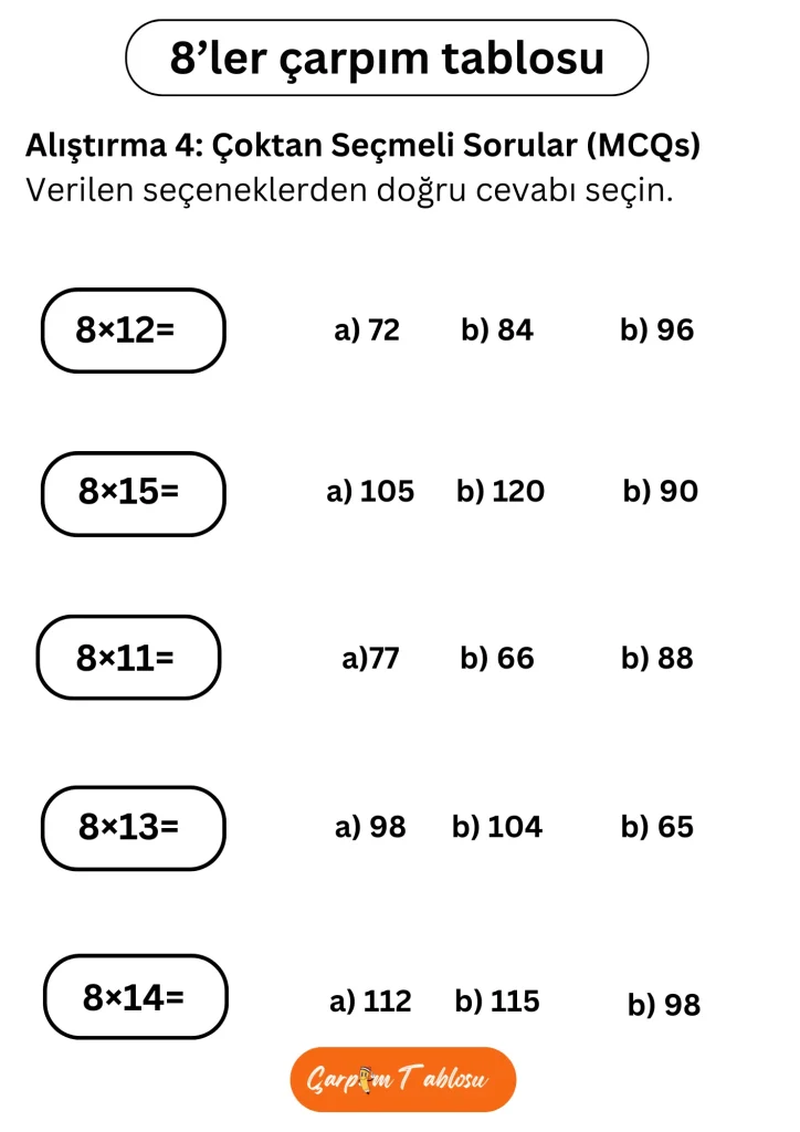 Çoktan seçmeli sorular (8 Çarpım Tablosu)