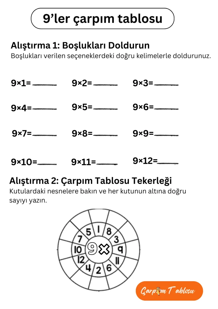 9’lu çarpım tablosunu öğrenmek ve pratik yapmak için sayfamıza hoş geldiniz! Burada tabloyu etkili bir şekilde öğrenmek ve ustalaşmak için egzersizler yapabilirsiniz.