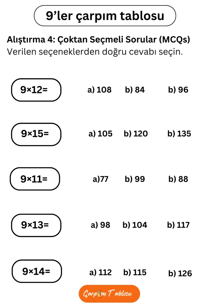 Çoktan seçmeli sorular (9 Çarpım Tablosu)
